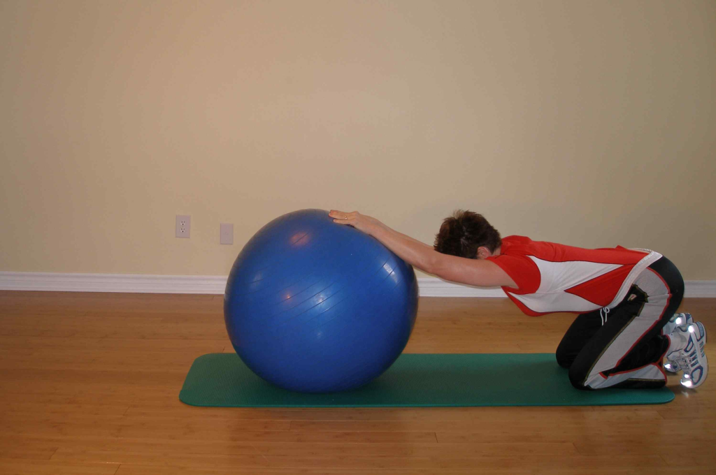 Sit on the exercise ball with your legs extended in front of you. Slowly lean forward until you feel a stretch in your hamstrings. Hold for 15 seconds before returning to the starting position.